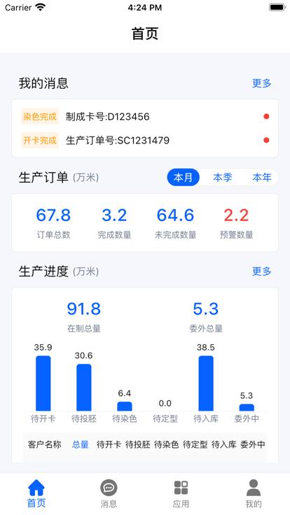 首页涉及消息、订单、进度、仓储等维度的指标概览,数据取自当前登录App业务员的相关订单。